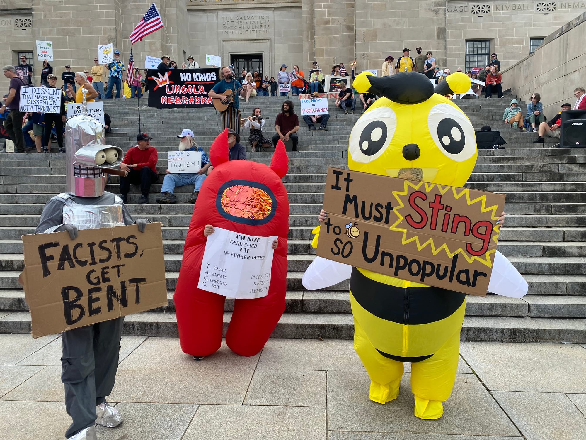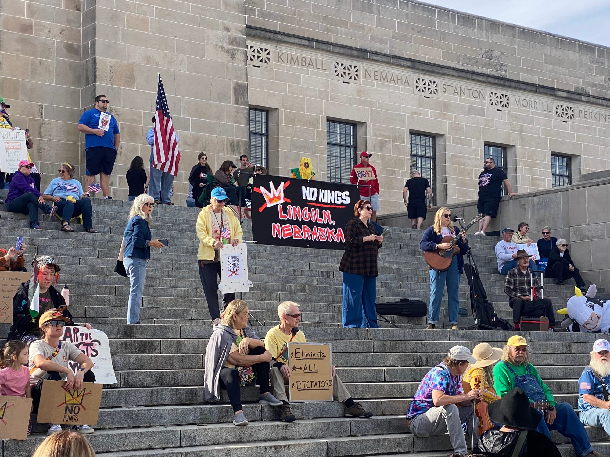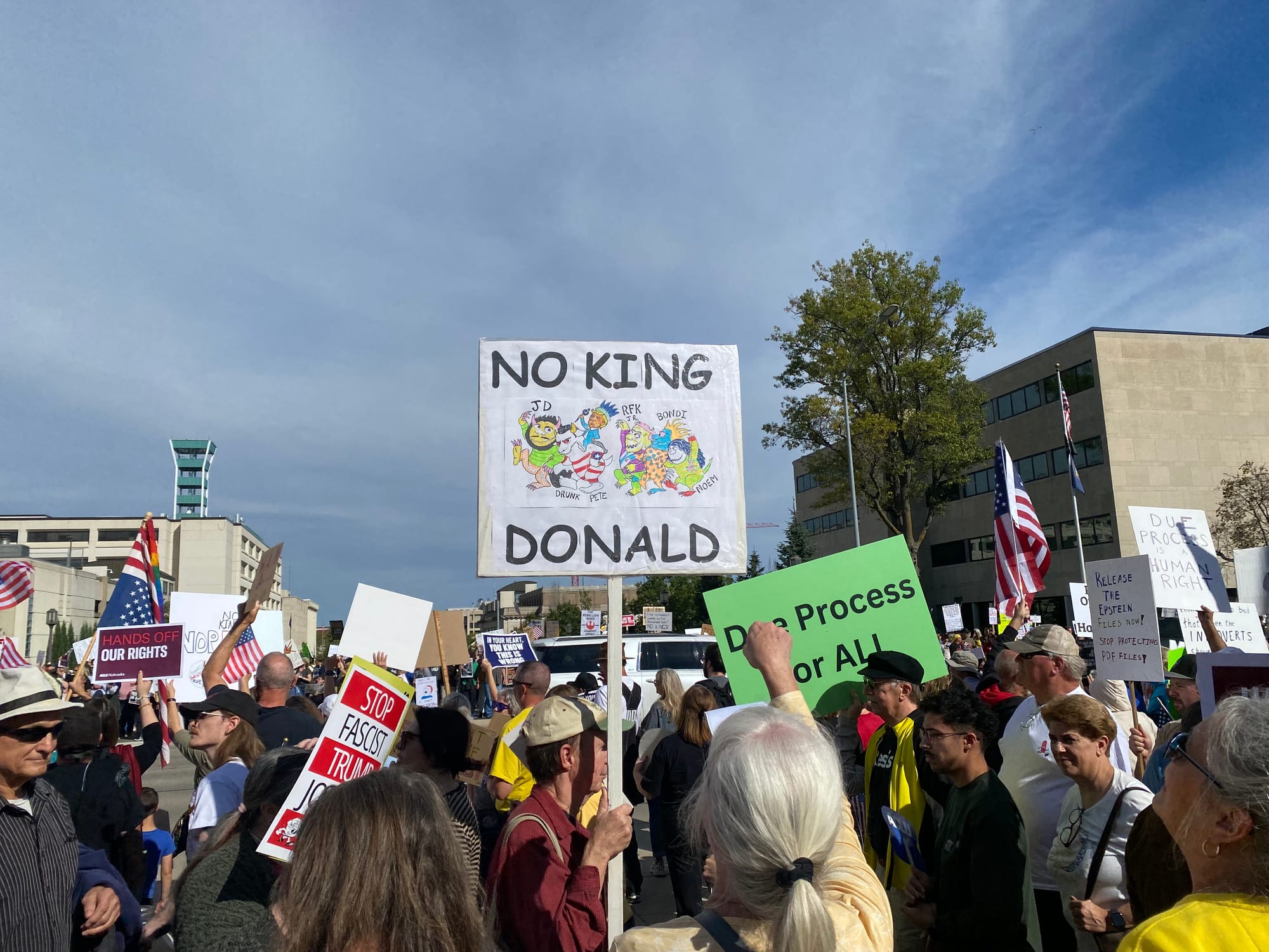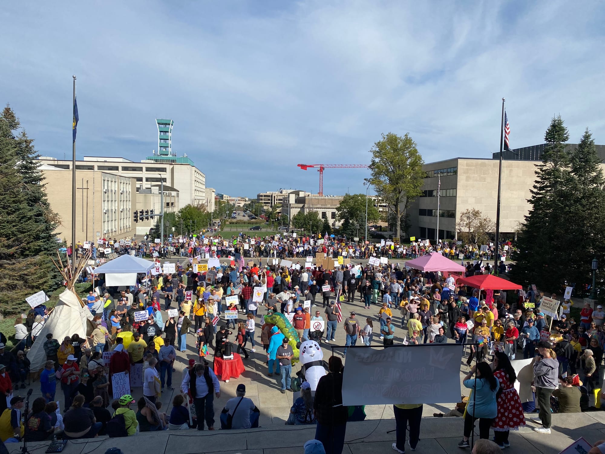 As I walked from my apartment to the Capitol yesterday morning, I didn't know what to expect. Were folks going to show? Were people still angry and energized enough to get off their asses? The news is infuriating but it's exhausting too. Shit wears you down. There was a pretty big turnout for the first No Kings protest back in June. But that already feels like it was six hundred years ago and also only a few dozen people showed up to the local rally against the McCook ICE facility last month.