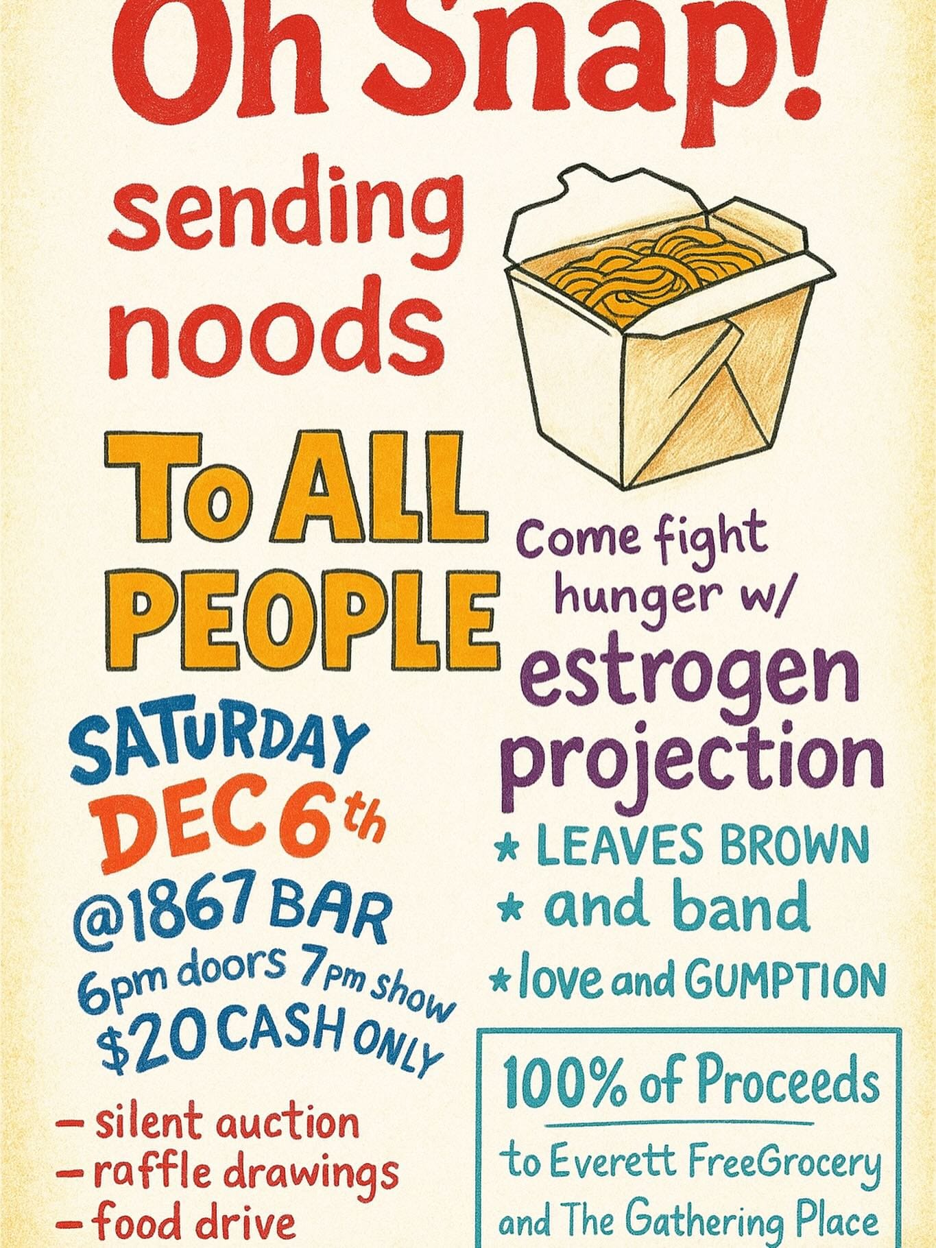 I also wanted to highlight this Saturday's benefit concert and food drive at 1867. There's a $20 cover (cash only), as well as a silent auction and raffle, and all the proceeds will go to support the Everett Free Grocery Program and The Gathering Place. The government shutdown is over, but the Trump administration is still doing its best to actively destroy programs like SNAP. Folks definitely still need support from the community. Come out on Saturday if you can! Doors open at 6 pm and the show starts at 7 pm.