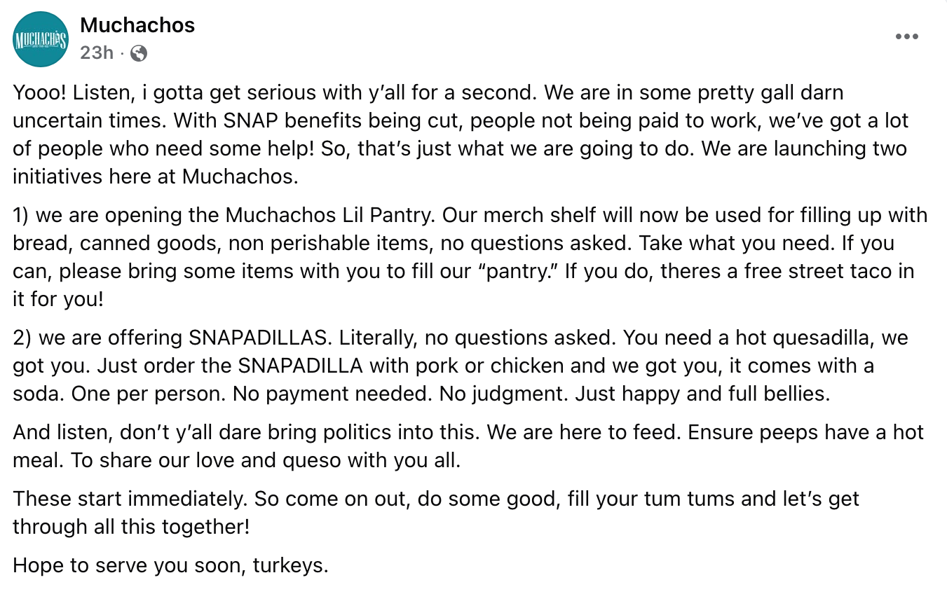 Like most folks I know, I try to be a good person (whatever that means). I know little individual actions are never gonna be enough when we've got massive systemic problems to solve. But also: Things would be so much worse if we gave up on the project of being halfway decent to our neighbors. Do you want to live in that world? I don't. And I also don't think any of us deserve a society that callous. So I guess what I'm saying is that small acts of communal solidarity may not be sufficient to save us right now, but they sure feel necessary.