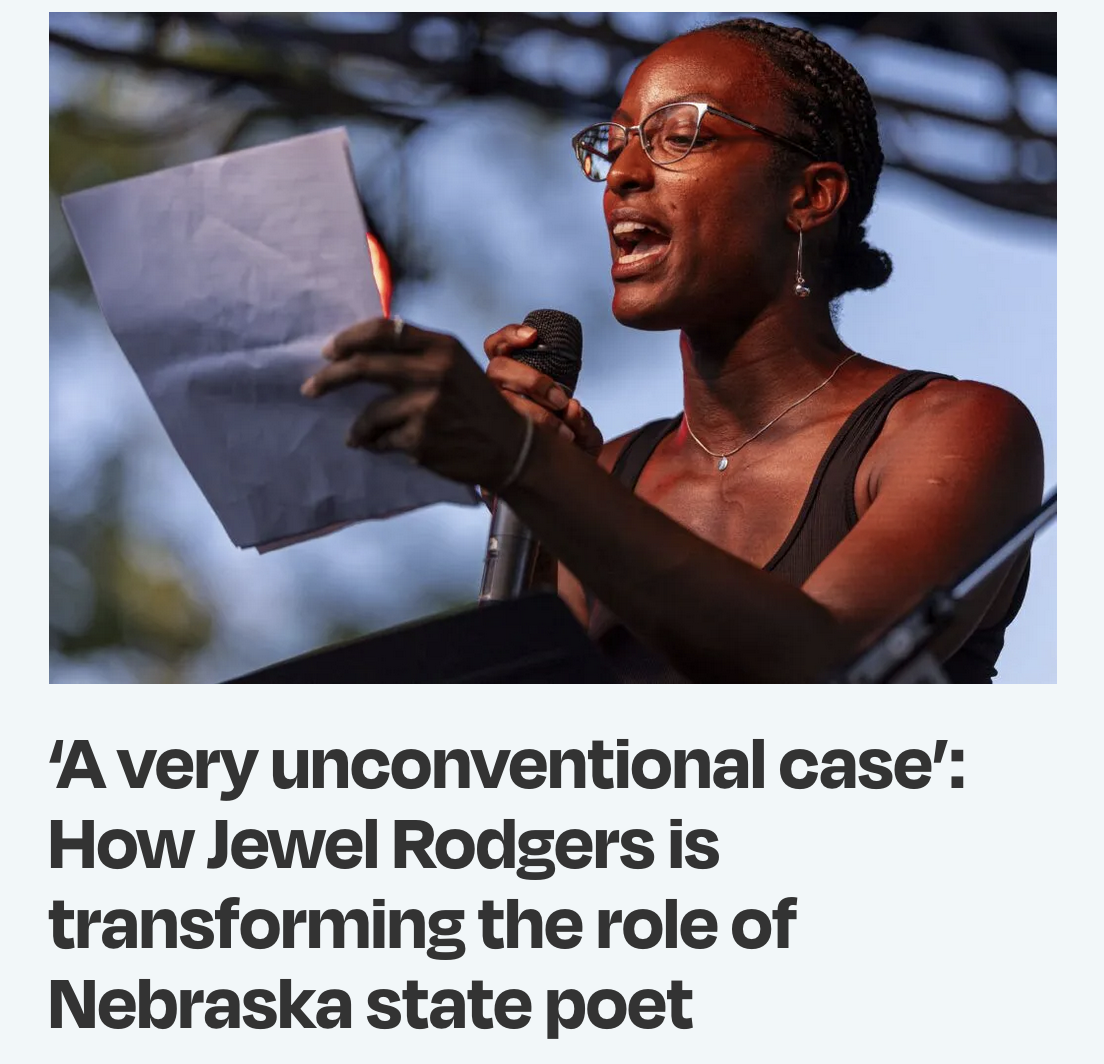 It's a profile of our state poet, Jewel Rodgers, who serves as Nebraska's chief advocate for, well, poetry (obviously) but also for literacy and literature more broadly. Basically, it's Jewel's job to get as many people as possible excited about poetry — which isn't a simple task. I mean, I'm interested in poetry but statistically, I'm an exception. (The best data I could find suggests that only about 9 to 12% of people in the U.S. have recently read or listened to poetry. While that's still tens of millions of people, I don't think it's enough to suggest Barnes & Noble will expand their diminutive poetry section anytime soon.)