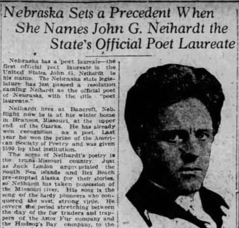 Another interesting bit of historical trivia: Though Neihardt lived much of his life in Bancroft, he had actually just moved to Branson, Missouri — e.g., Las Vegas if it were run by Ned Flanders — when the Nebraska legislature named him poet laureate.